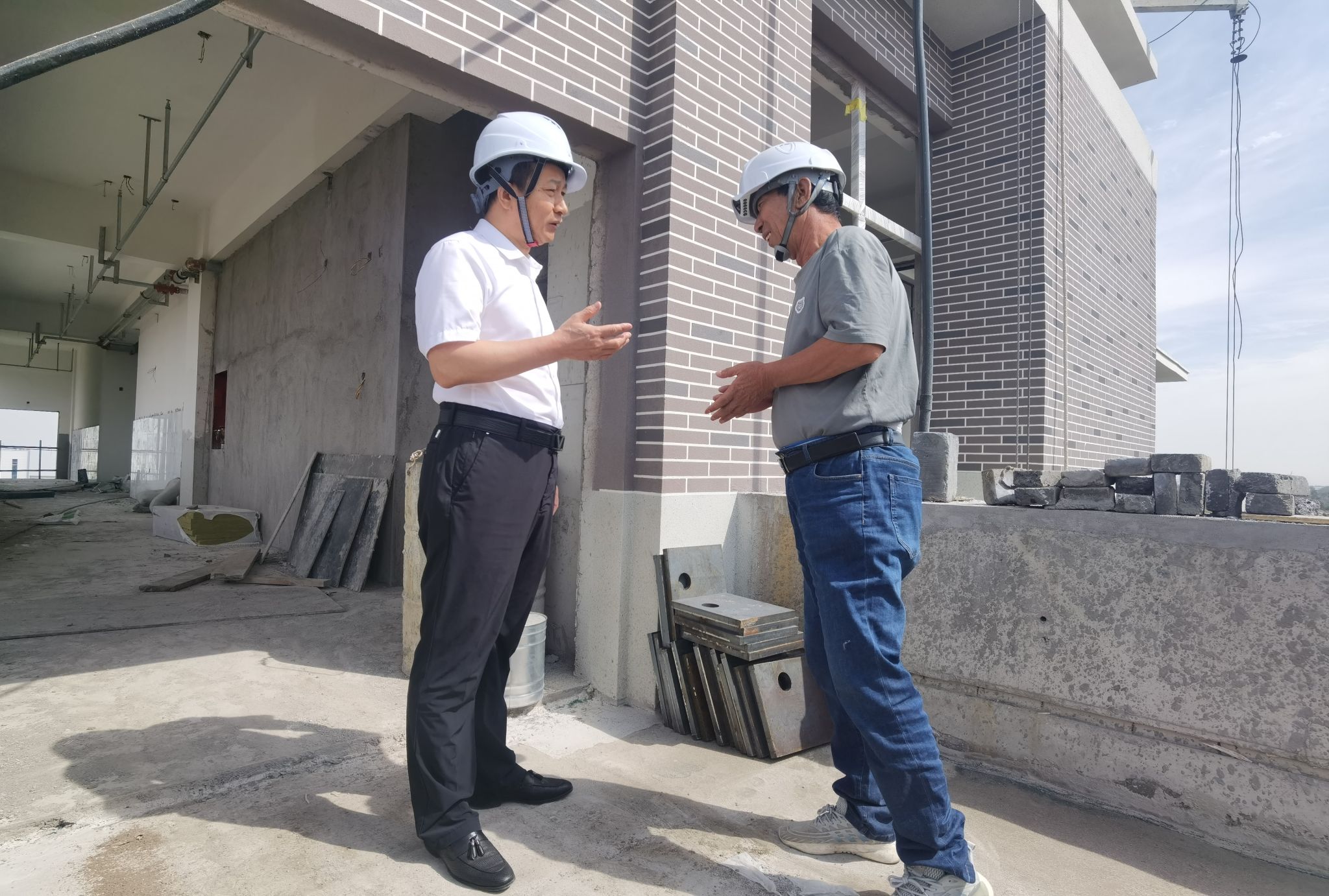 党委书记雷承锋视察了学院新校区产教融合实训楼建设施工现场,听取了承建单位项目部负责人对项目施工现状、预期完成目标等方面情况汇报,详细询问了坡屋顶挂瓦、屋顶平层防水、内墙地面装修、保温层及外立面喷涂、窗户玻璃安装等具体工程施工的进展情况、工地现场治理及安全生产措施的落实情况。每到一处,都仔细询问材料质量标准和选材把关流程,工程推进过程中存在的困难和问题等相关事宜。雷承锋鼓励施工人员鼓足干劲,保质保量加快施工进度;要求承建单位项目负责人和工程监理方要始终秉持建设高质量精品工程的理念,以细之又细的严谨作风紧盯施工各个环节、各项材料和施工工艺,时刻不放松地抓好工程质量;他强调要全面加强施工安全管理,遵守安全生产规章制度,认真落实安全生产责任制,切实做好施工安全防护及施工人员安全教育培训工作,提高安全意识,增强工作的责任感,确保安全生产“零事故”。