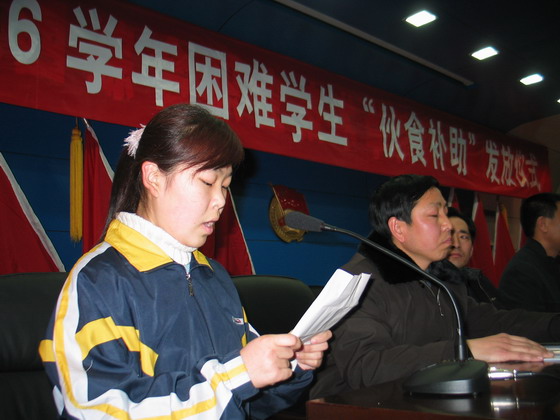 学生代表在发言中表达了对党和政府,高度重视并积极解决贫困生生活问题的感激,并表态一定要好好学习,掌握本领,将来报效社会,报效祖国。