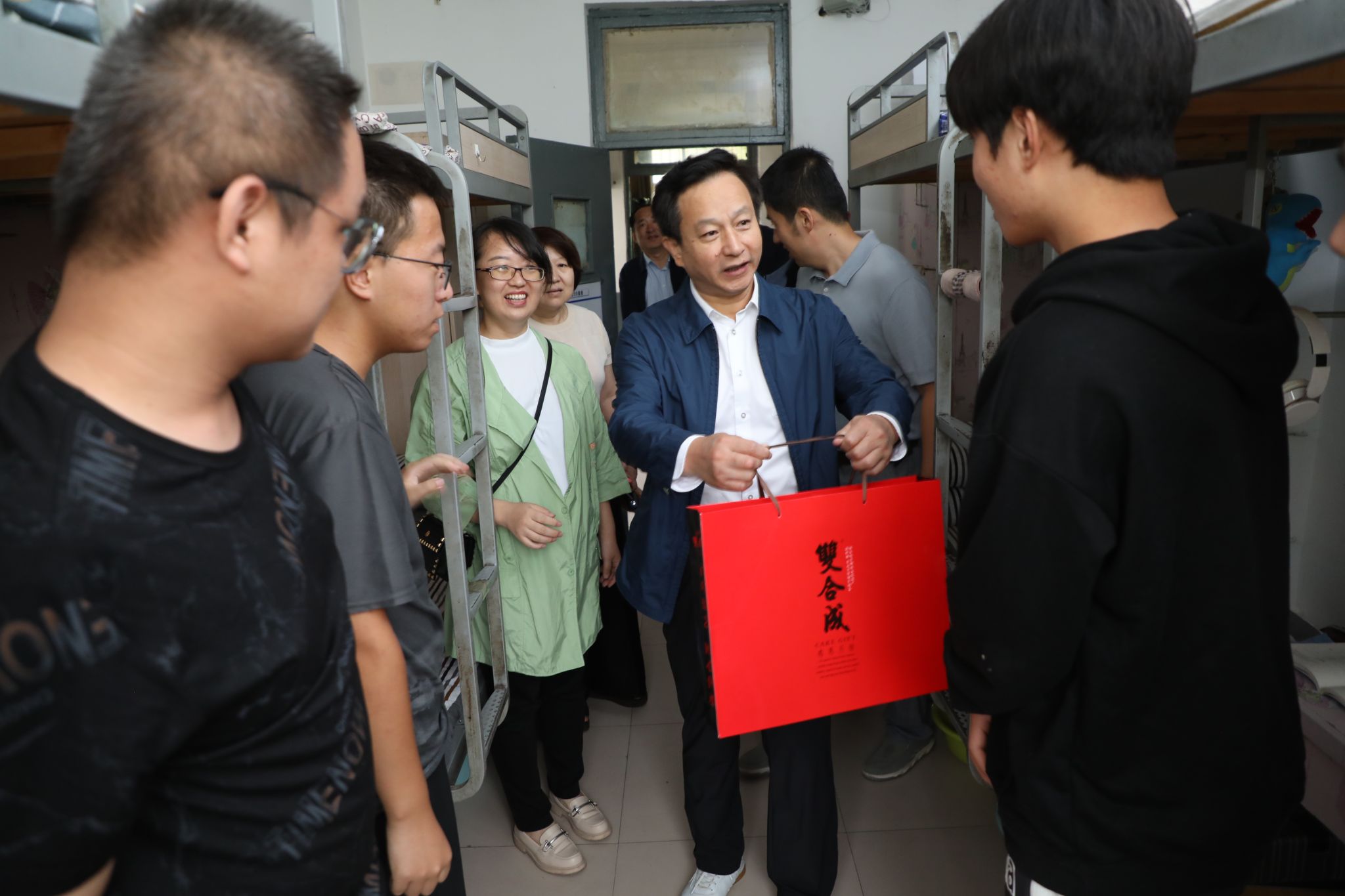 9月10日,正逢中秋佳节,学院党委书记雷承锋、院长何秋生、副院长尤陶江、赤新生、李芳等院领导分两组深入学院四校区学生宿舍,看望慰问中秋节在校的学生,与同学们共同欢度中秋,缓解同学们因疫情原因不能与家人共度佳节的思乡之情,并送上节日问候与诚挚祝福,为同学们带来了一份特殊的节日礼物。
