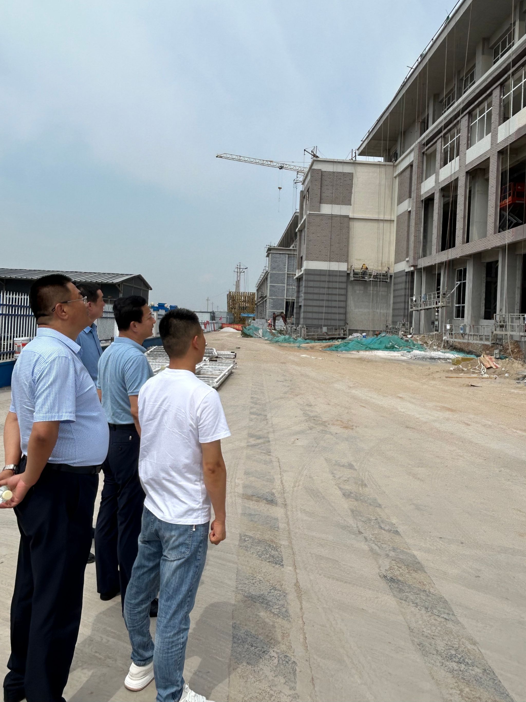 雷承锋一行实地检查了产教融合实训楼工程建设进度,重点查看了外墙真石漆、室内装修等样板工程,并提出优化方案和改进意见。