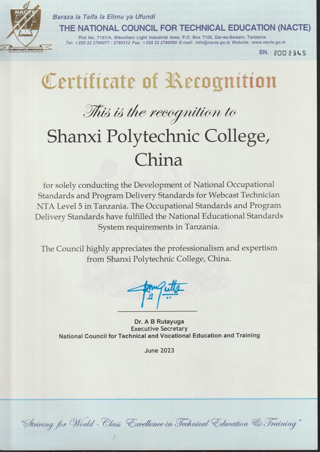 坦桑尼亚国家职业标准项目经申报、专家评审和在线答辩等环节,于2022年11月正式立项启动,依托学院工商管理系双师师资团队、深入的产教融合机制、创新的人才培养模式,与坦桑尼亚教育部国家职业教育委员会专家组织召开了多次工作会议进行深入研讨,通过深入的调研与比对,结合坦桑尼亚实际现状与需求,开发了网络直播技术员NTA5级的国家职业标准、及配套的专业教学标准等,最终顺利通过坦桑尼亚教育部国家职业教育委员会注册认证并获得官方认证证书,正式纳入坦桑尼亚国家职业教育体系。