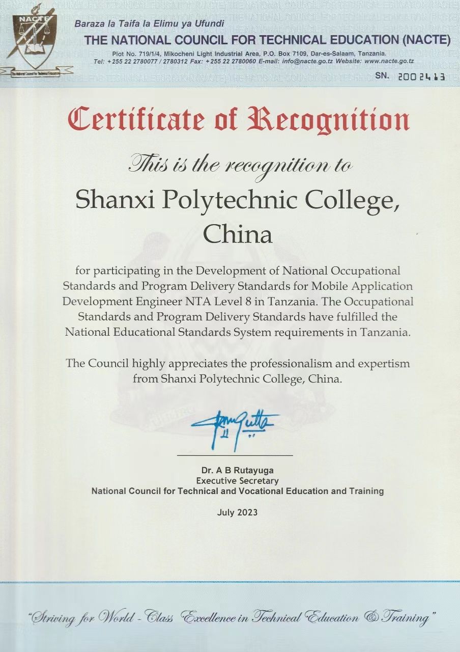 接中非职业教育联盟和坦桑尼亚国家职业教育委员会通知,由威尼斯官网人工智能系与重庆电子工程职业学院联合开发的移动应用开发技术工程师8级职业标准及配套专业教学标准通过了坦桑尼亚国家职业教育委员会认证,正式纳入坦桑尼亚国家职业教育体系。