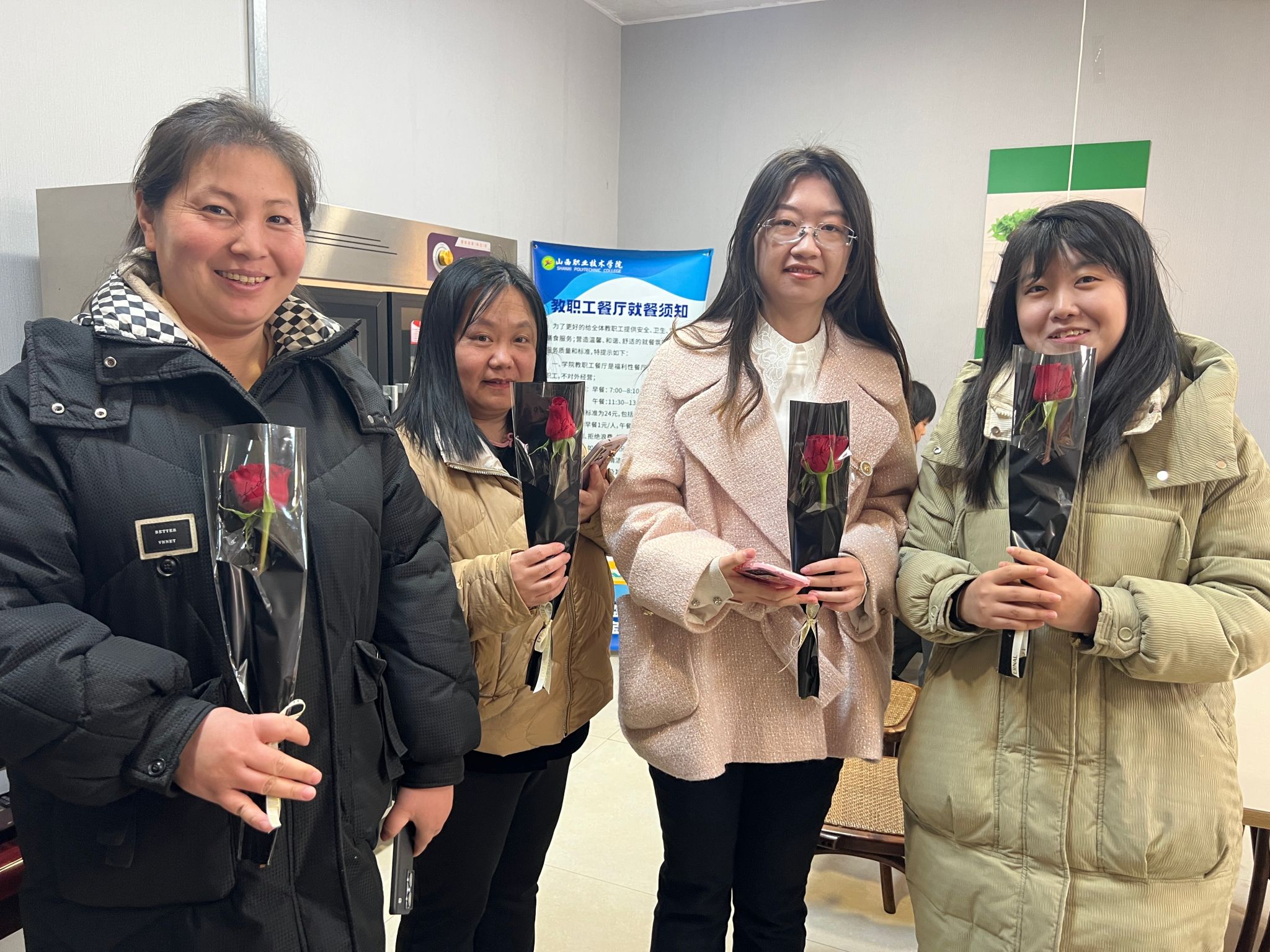 活动当天,后勤服务中心携手四校区餐饮公司,为女教职工们精心准备了一系列惊喜。中午时分,一场“盛大的庆祝午宴”在学院餐厅拉开帷幕。鲜花簇拥,美食飘香,处处洋溢着节日的喜庆氛围。女教职工们手持鲜花,脸上洋溢着幸福的笑容,她们在享受美食的同时,也感受到了来自学院的深切关怀。