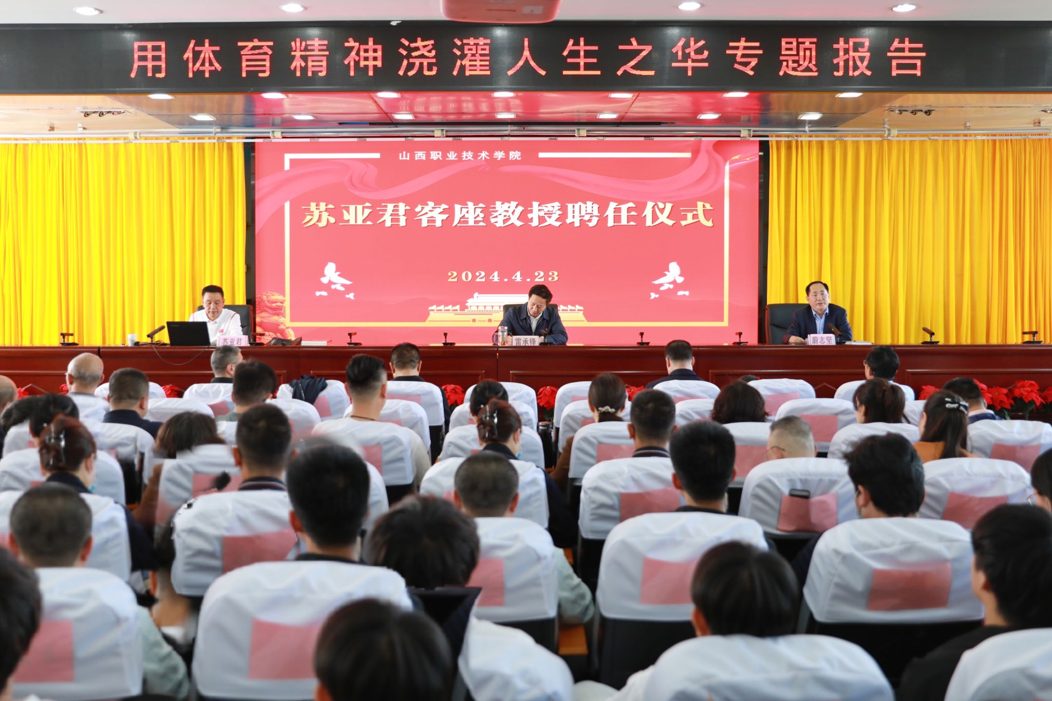 4月23日下午3时,原山西省体育总会主席、山西省体育局原党组书记、局长苏亚君受威尼斯官网邀请在坞城校区七楼会议室参加客座教授聘任仪式并做专题报告。党委书记雷承锋等全体院领导,学生工作部、团委、思想政治与理论教学研究部、体育教育部全体人员,各系部党总支书记、以及学生代表共同聆听了报告会。全院师生在线上参加报告会。报告会由党委委员、副院长蔚志坚主持。