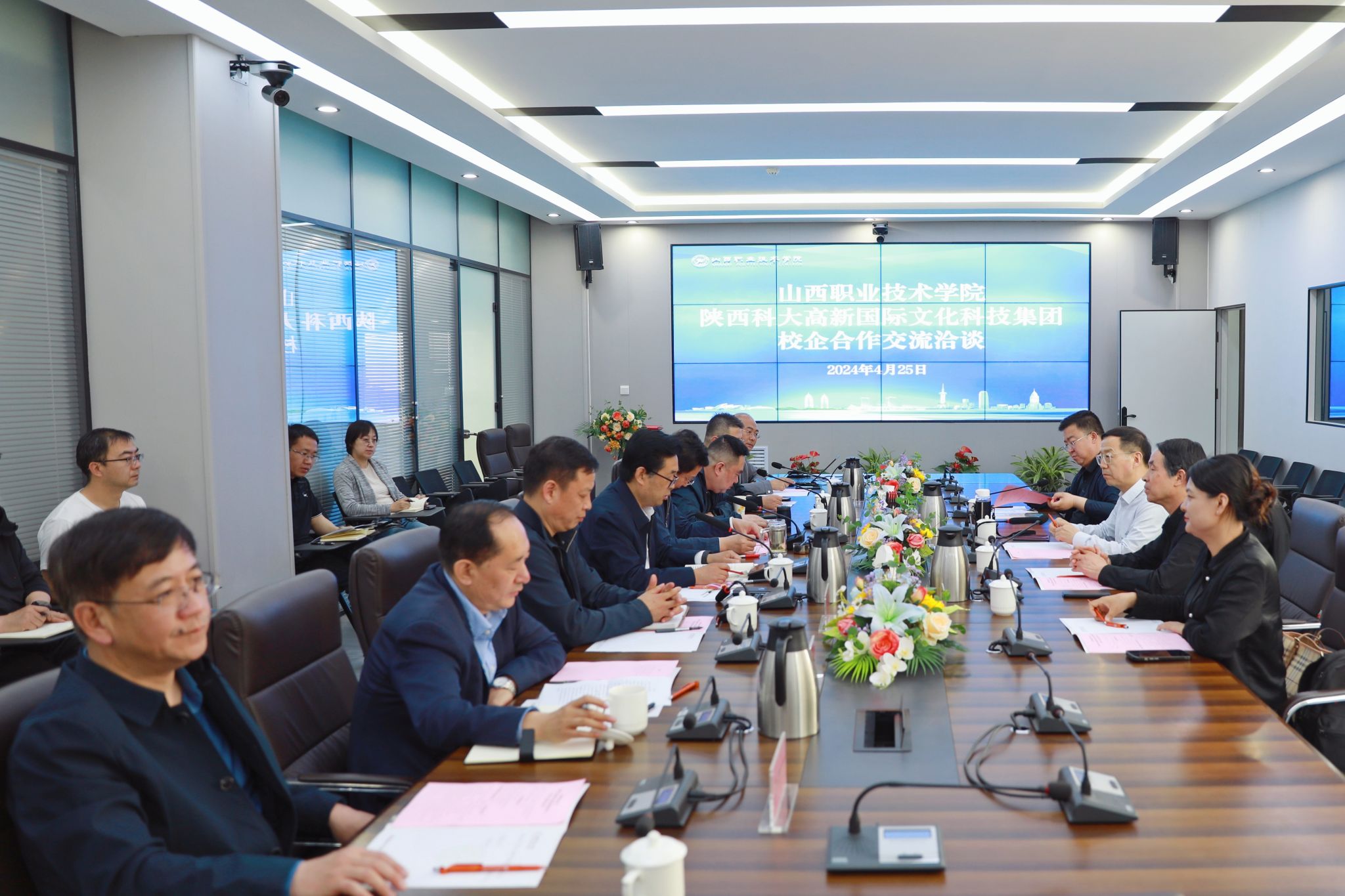 4月25日下午,陕西科大高新国际文化科技集团有限公司董事长孙龙杰一行四人来访威尼斯官网开展交流洽谈。学院党委书记雷承锋,山西省产教融合促进会副会长刘德有、副会长边军强,学院党委委员、副院长蔚志坚,党委委员、宣传统战部部长兼党政办公室主任宋海宏,及山西省产教融合促进会、学院教务科技部、“双高”建设办公室、产教融合与对外交流发展中心有关负责人参加交流洽谈会。山西省产教融合促进会副会长刘德有主持会议。