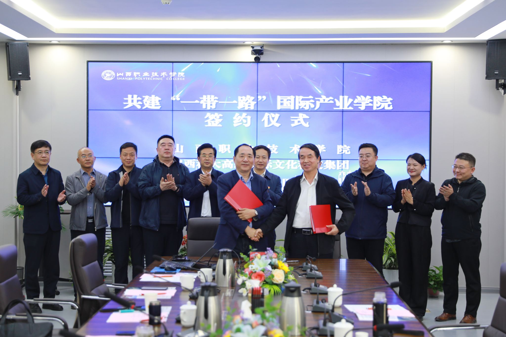 在与会领导的共同见证下,学院副院长蔚志坚、高新国际文化科技集团有限公司副总裁王国良分别代表校企双方签订了“共建‘一带一路’国际产业学院战略合作框架协议。”