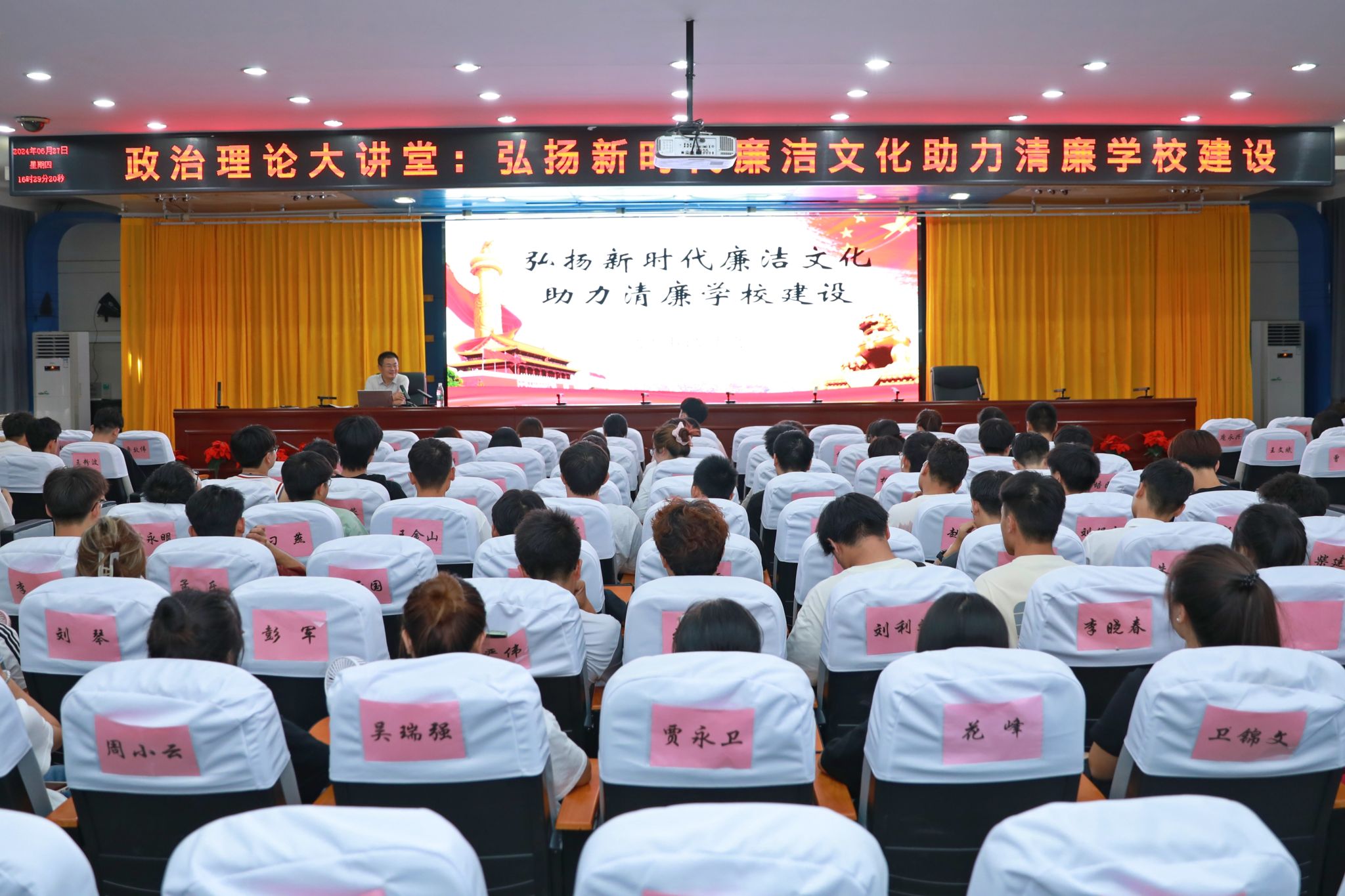 6月27日下午,学院纪委书记牛惠斌在坞城校区七楼会议室,以“弘扬新时代廉洁文化 助力清廉学校建设”为主题,为思政课教师和部分学生入党积极分子代表做了一场生动的廉洁教育讲座。