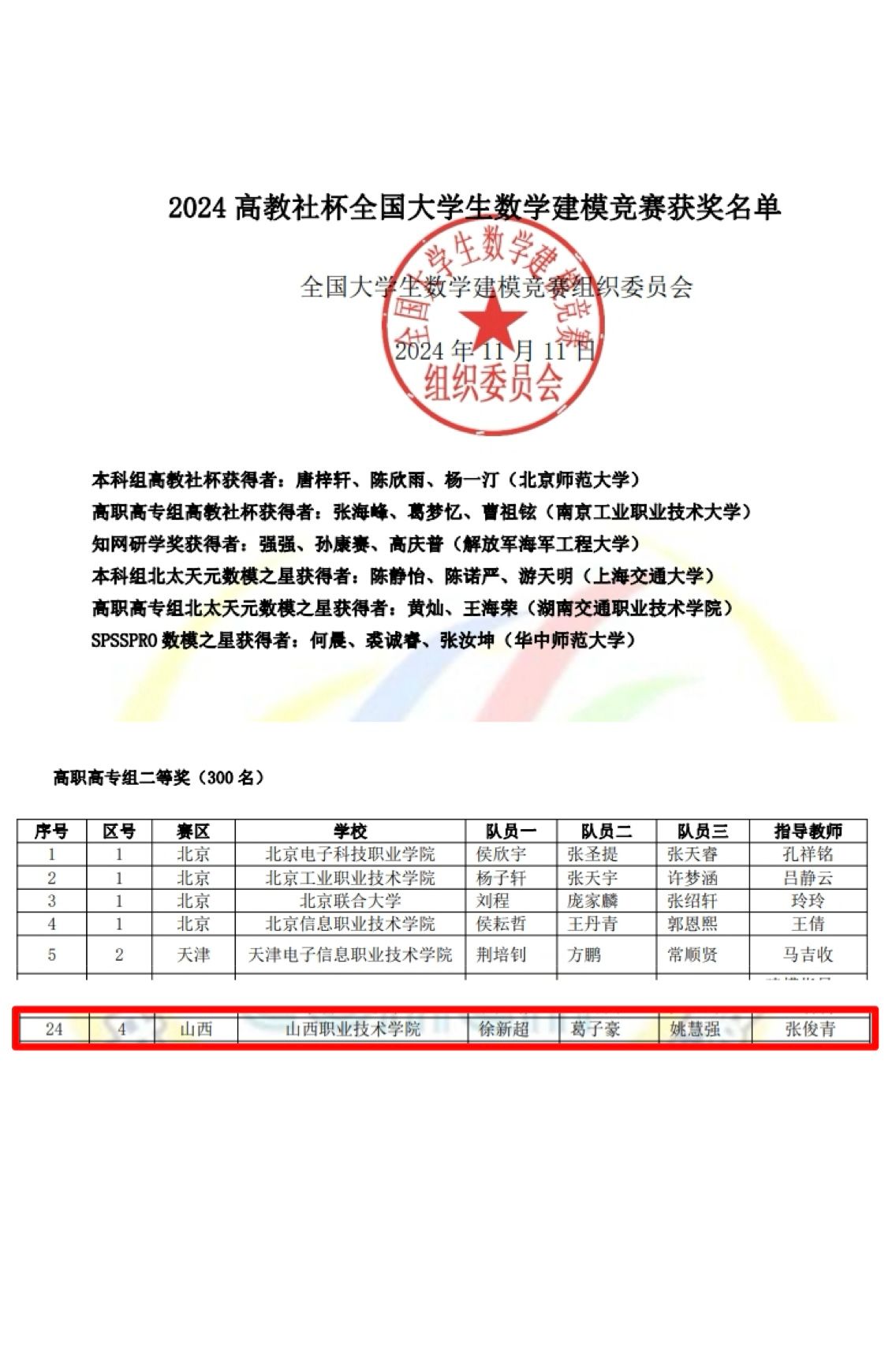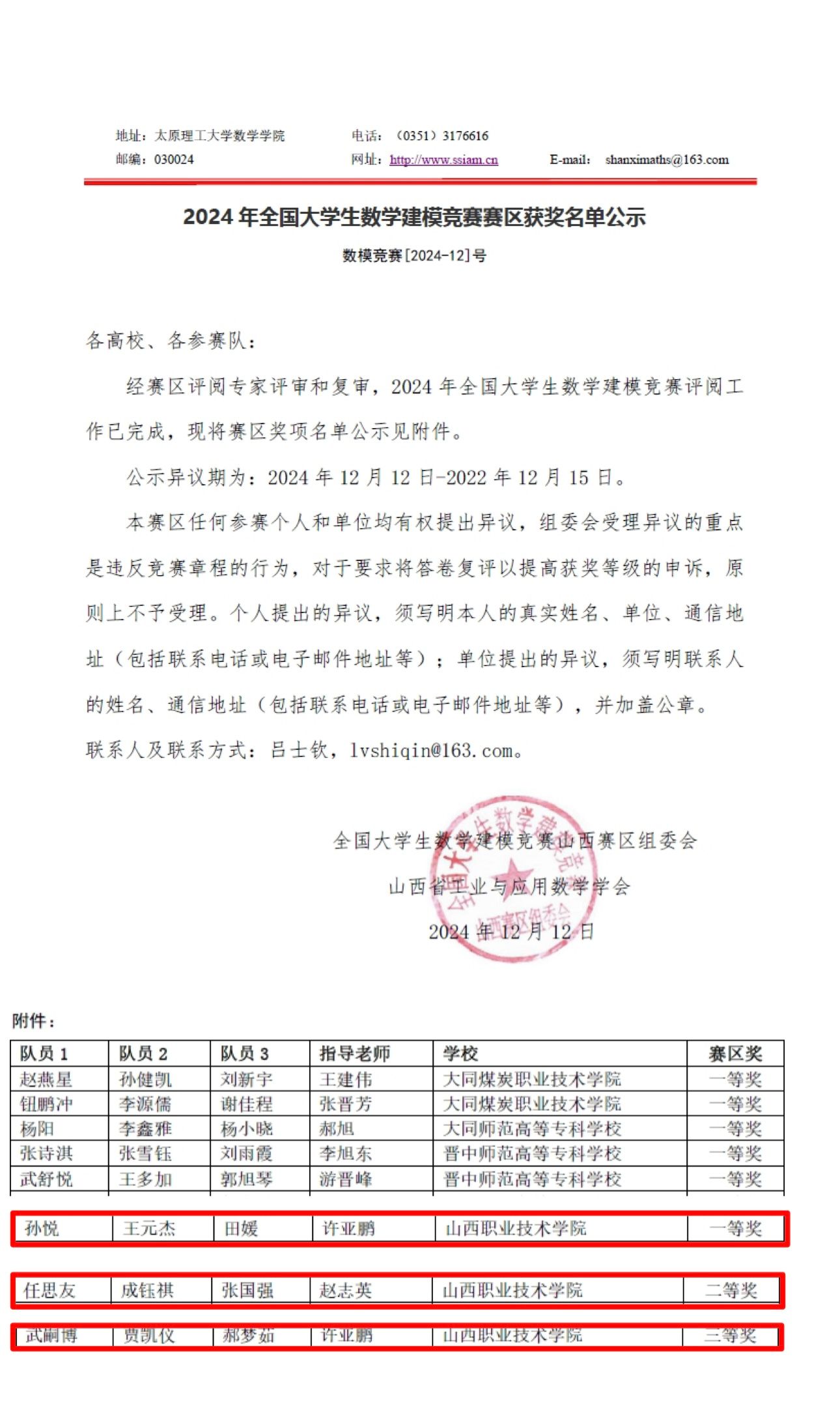 12月12日,2024年全国大学生数学建模比赛公布获奖名单,威尼斯官网学生连续两年在该项赛事中获得国家级二等奖,取得了新的突破!
