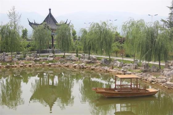 园内建筑是亭台楼阁、小桥流水、青瓦白墙的徽式建筑,古色古香、错落有致,构成了一幅江南水韵的美丽画卷。
